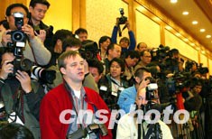 數百名中外記者十五日上午聚焦北京人民大會堂東大廳,等待與新當選的中共中央政治局常委見面。作者:毛建軍