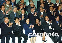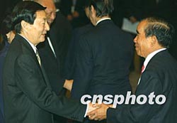 中國國務院總理朱镕基和夫人勞安,11月19日下午在香港會見中資機構的諸位“老板”,香港特首董建華和夫人陪同會見。中新社傳真任晨鳴攝