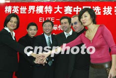 精英世界模特大賽中國選拔賽簽約儀式二十一日在北京新絲路模特經紀公司舉行,新絲路模特經紀有限公司總裁李小白(左三)、精英世界模特大賽機構(ELITE MODEL LOOK)總經理愛提爾(左四),PIER ENTERPRISES公司總裁穆特(左五)等一起握手,開創了一種全新的合作方式。此舉將進一步推進中國模特國際化、商業化進程。作者:毛建軍