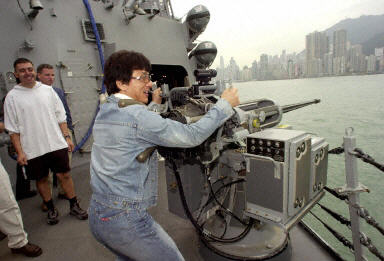 當成龍踏上甲板時,看見艦上的機槍,便二話不說跑到機槍前,向維多利亞港作狀開槍掃射,姿勢有板有眼。當參觀船上的總控制臺時,艦長教他如何駕駛,令成龍十分興奮。不少船員更自備相機,爭相與他合照。由于盛情難卻,成龍一口氣為逾百船員簽名。