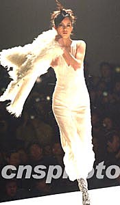 張繼成“頹廢的生靈”主題時裝發布會二十五日晚在中國國際時裝周上舉行。其設計靈感來自于本世紀初的恐怖事件,作品借助白色、黑色、米色等高雅顏色,表現人們的世紀矛盾心態。毛建軍 攝