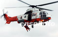 十一月二十八日,香港海事處舉行搜救演習,圖為政府飛行服務隊的直升機正在拯救“撞船事件”中受傷的乘客。中新社傳真 潘索菲 攝