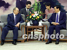 胡錦濤首先對普京的來訪表示熱烈歡迎。他說,值中國共產黨十六大召開不久在北京與總統閣下再次見面感到非常高興。去年十月,他應邀訪問俄羅斯,總統閣下關于國際形勢等問題的見解給他留下很深印象。那次訪問時間雖短,但情形仍“歷歷在目、記憶猶新”。