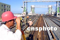 12月2日,隨著最后一根長25米的特制鐵軌,成功鋪設在粵海鐵路南港棧橋橋面,全長8738米的粵海鐵路南港棧橋鐵軌與海口火車站鐵軌接軌。至此,中國第一條跨海鐵路粵海鐵路南北港碼頭鐵路線全線貫通。圖為施工人員在南港棧橋上進行測量和鋪軌工作。古月 攝