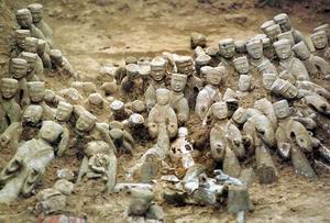在長9.7米、寬1.9米的陪葬坑內,展現在世人眼前的是距今二千多年前的漢代王侯貴族車馬出行時的豪華陣容,只見最前一排是五匹陶制的高頭大馬,馬身上都騎著神態各異、栩栩如生的陶俑。