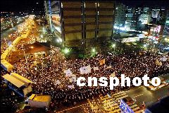 今天下午3時,漢城各社會團體和大學生7000人在市中心舉行追悼會,譴責美軍裝甲車軋死2名韓國女中學生。韓國大國家黨總統候選人李會昌出席追悼會,并再次要求美總統布什親自道歉和修改“駐韓美軍地位協定”。追悼會后,集會者走上街頭舉行了大規模燭光游行。目前已有近3萬人聚集在漢城市中心,并徒步向美國駐韓使館移動。韓國防暴警察已進入緊急警備狀態。目前,市中心的交通已經癱瘓,燭光游行正在平穩舉行,沒有發生暴力事件。