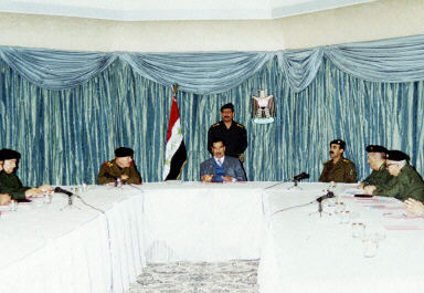 12月7日,伊拉克總統(tǒng)薩達(dá)姆(中)在巴格達(dá)主持內(nèi)閣會(huì)議。薩達(dá)姆就伊拉克1990——1991年間占領(lǐng)科威特一事向科威特人民表示道歉的講話。這是薩達(dá)姆首次就入侵科威特表示道歉。