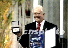 十日,美國前總統吉米·卡特在挪威首都奧斯陸接受了諾貝爾評審委員會為他頒發的二OO二年度諾貝爾和平獎。作者:中新社