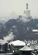北京城中心的北海白塔十五日披上雪花銀裝,歲末的降雪更顯寒冬的肅穆。作者:賈國榮