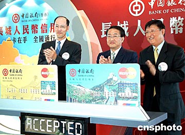 中銀香港總裁劉金寶博士、副總裁林炎南及中銀卡(國際)有限公司總經理蘇誠信,12月17日主持儀式,推介香港發行的首張人民幣信用卡。洪少葵 攝
