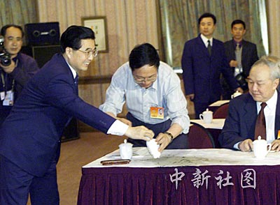國家副主席胡錦濤在“兩會”期間看望參會的全國政協委員時,蔡義江委員不小心弄灑茶水,胡錦濤從自己桌上拿起毛巾幫他擦拭。作者:滿會喬