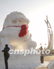 二零零三年長春凈月潭冰雪旅游節的游樂園準備就緒,大型雪雕作品《雄獅》正在最后修飾,三十六個景區共有四百九十三件冰雪雕作品。作者:韓丹