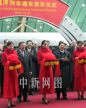 三十一日,世界第一條磁浮商業示范運營線——上海磁浮列車線在滬通車,中國總理朱镕基與德國總理施羅德參加通車典禮并試乘了首發列車。圖為中德兩國總理在龍陽路車站為上海磁浮列車通車剪彩。中新社 王健 攝