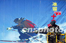 一名工人五日在哈爾濱街頭張掛冰雪運(yùn)動(dòng)宣傳畫,為五日晚在這里開幕的國第十屆冬季運(yùn)動(dòng)會(huì)暨第十九屆哈爾濱國際冰雪節(jié)造勢(shì)。作者:毛建軍