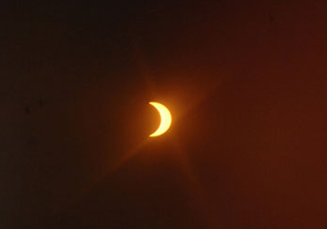 22日晨,綿陽上空萬里無云,非常晴朗。太陽照常升起,直到8點20分鐘左右,突然發(fā)現(xiàn)太陽上半端出現(xiàn)一個缺口,缺口越來越大,到8點55分左右,基本上只有少半個月亮大小。天色轉(zhuǎn)暗,天氣轉(zhuǎn)涼,城市路燈全部打開。隨后,一大片烏云籠罩在綿陽城的上空,把太陽完全遮蔽,直到59分時,太陽從烏云里露出來,完全就是一個上弦月形狀。瞬間,又隱入烏云中。