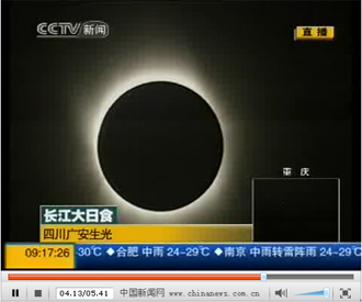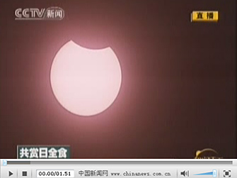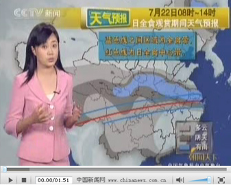 - 中新網(wǎng)報道:2009-7-22 09:58長江流域今天上午將出現(xiàn)罕見日全食,寶島臺灣也能看到日偏食,民眾相當期待,兩岸三地首次進行聯(lián)合現(xiàn)場轉(zhuǎn)播。