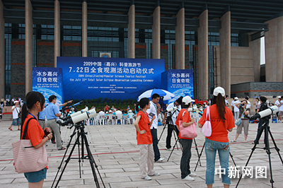 - 中新網(wǎng)安徽記者連線:2009-7-22 08:19今天,因長江流域多個觀測點天氣不佳,很多天文愛好者轉(zhuǎn)戰(zhàn)多地,來到銅陵。一位從南京到上海發(fā)現(xiàn)天氣不佳,連夜感到銅陵,剛才記者遇到這位四十多歲的漢子時,腳上全是泥巴,還真啃著燒餅。幾位馬鞍山市的高三畢業(yè)生,因為馬鞍山的天氣原因,來到銅陵,但是很不巧,昨夜后半夜銅陵下暴雨,但是他們六位學生內(nèi)心咯噔了下,好在今早天氣很給面子,七點多,太陽從云縫間落出臉,但是目前,銅陵的觀測點烏木山的山空,全是云,不見陽光,在四處觀看的天文愛好者有些擔憂。