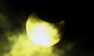 8時45分,天空出現(xiàn)大量薄云。伴隨云層越來越厚,天空變暗時,西北師大符彥飆博士說,有薄云和空氣的輕度污染,觀測相切不是很明顯;9時15分時,從蘭州可觀測到食甚,月球遮住太陽光面積達到最多,太陽“缺掉”80%。 有云層不失為一件好事,一童聲驚呼:“月亮”!透過厚厚的白云,此時用普通的觀測儀器,只能看見天空一片黑,用肉眼觀看是最好不過的了,符彥飆風趣道,“白天的月亮”。據(jù)符彥飆介紹,蘭州出現(xiàn)日偏食是在8時11分上演,持續(xù)了2個小時13分。完