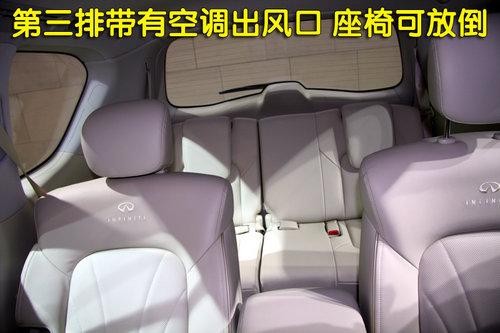 接下來我們就要說到第三排座椅了,也許這里的使用次數并不會很多,但是英菲尼迪同樣為第三排乘客提供了空調出風口,大大提高了舒適度,如果有人故意將我擠到最后面的話,我想我還是可以接受的。如果當你需要更大的空間作為儲物用途時,第三排座椅可以進行4/6拆分放倒,這一點你要相信它的實力。總之如果你需要一些個性,又想兼顧品質與豪華舒適,這款英菲尼迪全新QX56應該會很貼合你的想法。