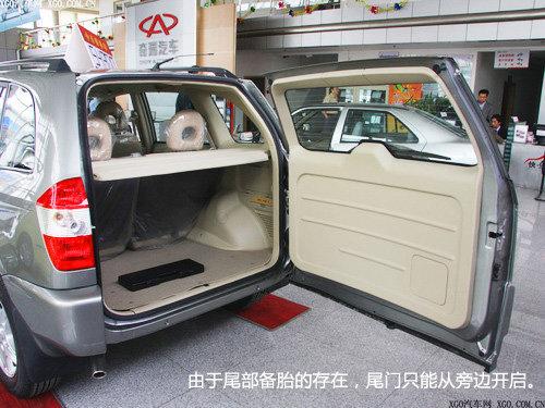 瑞虎的整體造型更偏重時尚,U型鍍鉻進氣格柵,氣勢比較平和,顯得比較秀氣;車身側面的時尚車貼,加強了幾分動感;而掛在車門上的備胎才能真正的透露出瑞虎的一絲野性,不過由于備胎的存在,尾門只能從旁邊開啟。