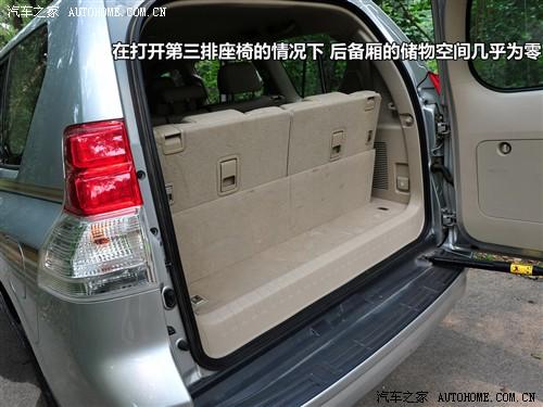 在打開第三排座椅的情況下,普拉多后備廂的儲物空間已經近乎于零了,所以滿載7人之后,應該趕快把第三排座椅收回去,不會?請看上圖。收起第三排座椅同樣是兩步,先摳起座椅旁邊的機關,椅墊就可以自動收回了,然后再摳起椅背上的開關,放倒椅背就可以恢復如初了。