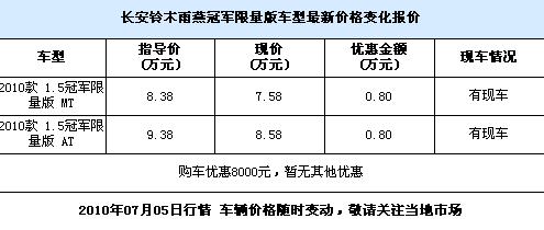 近日,筆者走訪長(zhǎng)安鈴木北京4S店了解到,目前已經(jīng)批量到店一批2010款長(zhǎng)安鈴木雨燕冠軍限量版車輛。購(gòu)車可以讓利8000元。具體詳情見(jiàn)下表: