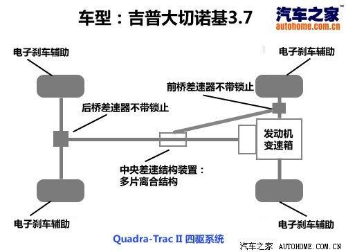 大切諾基采用前后整體橋的非獨立懸掛,這在結構在本身上也偏重越野。進入國內(nèi)的大切諾基有兩款車型,排量分別為3.7升和5.7升,兩款車型采用的四驅(qū)結構并不相同,主要體現(xiàn)在3.7升車型前后軸上沒有差速鎖,盡管它的電子輔助系統(tǒng)也足夠強大,但在通過一些難度較大的交叉軸項目時,電子輔助還是比機械結合反應緩慢一些。
