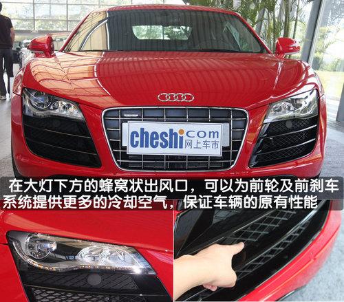 奧迪R8的駕駛艙相對靠前,而在駕駛艙之后則是巨大的引擎室——這是典型中置發動機賽車的特征,這種設計也大大優化了車身前后比例,使R8的前后重量分達到了44:56。透過R8后方透明的發動機罩,V10 5.2升FSI發動機安靜的伏臥其中。在設計師所營造的視覺效果下,人們很容易把它與賽車聯系在一起。即便在一個不了解賽車的人面前,也一定能從中看出它的與眾不同和獨一無二。
