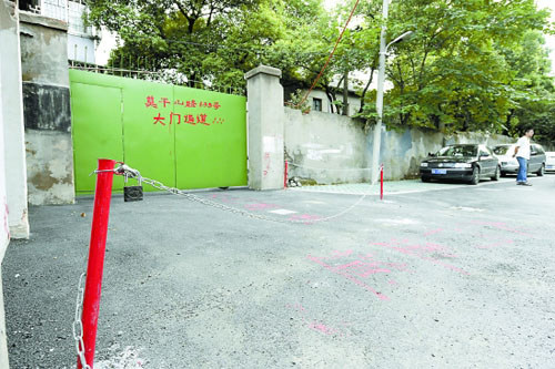 綠色的鐵門上,用紅色油漆赫然寫著“莫干山路633號大門通道”,被圈的地面上寫著“大門通道”幾個大字。