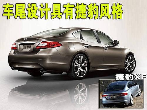 2011款英菲尼迪M在外觀設計上,吸取了在2009年日內瓦車展上展出的Essence概念車的設計元素。帶有上下拱形線條的長方形格柵,向后拉伸的L形大燈,發動機蓋兩邊巨幅隆起的動感褶皺以及優美流暢的腰線。新款M的車尾方面,第一印象給了我們一種強烈的捷豹風格,收縮的臀部以及尾燈都讓我們想起了捷豹XK的動感車尾。
