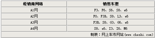 另據了解,比亞迪M6將在A4網中銷售,其他車型還包括I3、I6等未上市新車和e6新能源車,已上市的只有S8跑車。而A1、A2、A3網絡的新車推出規劃已經接近完成,只有像S6、G6等少數車型未上市銷售。