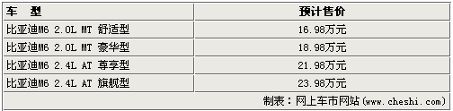 據比亞迪經銷商處銷售人員介紹,M6將在20日正式上市,預熱宣傳活動已經全面展開,將推出2.0L手動舒適型、豪華型和2.4L自動尊享型、旗艦型,預定價為16.98-23.98萬,前期預定該車的客戶可享受優先提車、提車不加價等優厚待遇。