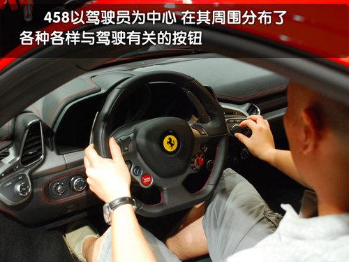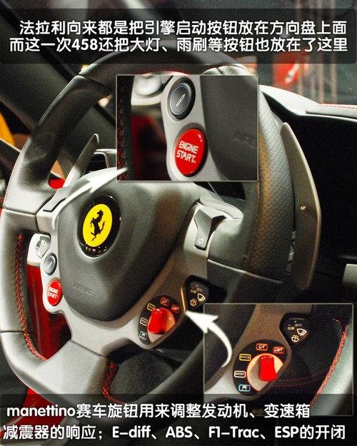 458Italia的內飾設計理念是以駕駛員為核心,所以身處駕駛席的時候你會發現在你的眼前以及左右手的周圍分布了非常多的儀表、按鈕,這種感覺有點兒像是坐在一臺飛機的駕駛室里面。想要熟悉一下458Italia的這些按鈕真的需要一些時間。