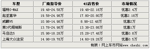 通過(guò)上表我們可以看出,六款車(chē)型在售價(jià)方面都有不同程度的下浮。其中以嘉華、福特S-MAX和威麟V5為首的大幅度降價(jià)車(chē)型,降價(jià)幅度都達(dá)到了2萬(wàn)元以上。第3代閣瑞斯獨(dú)領(lǐng)一萬(wàn)元降價(jià)區(qū)間,馬自達(dá)5和途安這兩款更為熱銷(xiāo)的車(chē)型,由于關(guān)注度較高,現(xiàn)車(chē)也較為緊張,優(yōu)惠幅度也僅有5千元和8千元的小幅度降價(jià)優(yōu)惠。