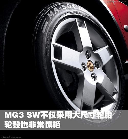 第一眼看到MG3sw,我們就會被純正的英式風格所震撼。在MG3sw的車頭部分,我們可以看到很多分體設(shè)計的元素,前大燈、霧燈、中網(wǎng)都采用了對稱的排列方式,在蘊含動感的同時也有一絲紳士風范。車頭和車尾低平而飽滿,引擎蓋上3道線條均勻地勾勒出一種力量感。最小離地間隙大于160mm的高通過性底盤,與車身顏色不同的全身大包圍,都表現(xiàn)出了MG3sw所具有的通過能力。