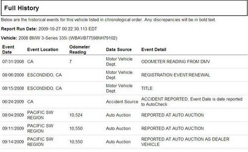 在這完整的歷史報告中可以看出這車是在2008年7月掛牌上路的,車牌注冊地點是美國加州(CA),在2009年6月時出過車禍(Accident Reported, Event Date is date reported),車禍嚴重情形從這報告中看不出來,2009年8月時在標場出售,出售時里程數為10524英里,在美國通常法院、銀行或貸款公司會將長期租賃車(Leased car)或法拍車丟到標場去拍賣(auction),長期租賃車是租約到期(通常為2-4年,也有一年的)還給銀行或貸款公司。