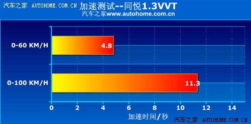 2010款1.3L同悅搭載了帶有雙VVT技術的雙頂置凸輪軸全鋁發動機,相比老款在性能上有了小幅提升,最大功率99Ps/6000rpm,最大扭矩126N·m/4500rpm;該發動機并非自主研發,而是江淮進行針對性改造誕生的;在實際測試中變速箱配合著發動機,整個加速過程比較線性,動力分配均勻,沒有突兀的爆發點,最終加速時間為11.3s,成績合格。
