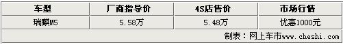 奇瑞高端品牌-瑞麒相繼推出M1、G5、X1之后,M1三廂版車(chē)型M5已經(jīng)悄然在北京地區(qū)銷(xiāo)售,1.3L手動(dòng)豪華版售價(jià)5.58萬(wàn)元。
