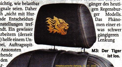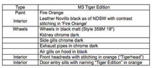 外觀方面,M3 Tiger特別版的進(jìn)氣格柵、反光鏡邊緣都使用了黑色,而車(chē)輪部分也升級(jí)為寶馬的359M系列(16輻)運(yùn)動(dòng)化鍛造黑色19英寸輪轂,配合銀色的鍍鉻排氣管。內(nèi)飾部分,M3 Tiger紀(jì)念版的內(nèi)飾為黑色真皮坐椅,對(duì)應(yīng)火焰橙的走線。