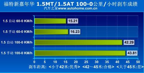 從實際的測試中也能看出,同樣搭載1.5L發(fā)動機的車型,配合5速手動變速箱就可以跑進11秒內(nèi),而換用技術(shù)落后的4AT變速箱后加速成績則下降了將近兩秒。而在剎車方面嘉年華的表現(xiàn)一般,43米上下的成績只能算是合格水平。