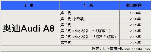 Audi A8是奧迪汽車的豪華旗艦車型,與其競爭對手梅賽德斯-奔馳S級以及寶馬7系相比,奧迪A8還很“年輕”。說起A8的歷史,自1994年推出至今僅有十余年,但不得不承認的是奧迪A8成長的很快,從低調(diào)到張揚大膽的創(chuàng)新設計引領了豪華轎車的發(fā)展方向。下面我們就一同來了解下這款“年輕”旗艦車型的歷史。