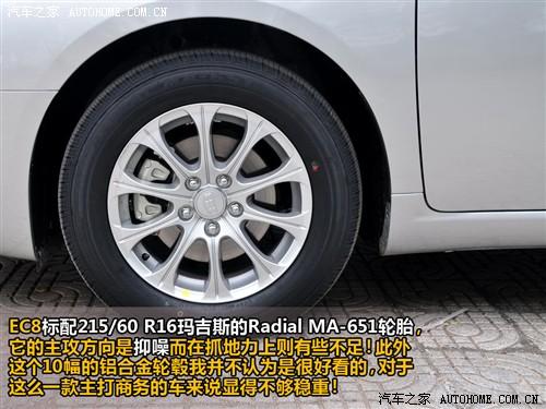 作為一款中型豪華車型,帝豪EC8必須使用鋁合金輪轂,不過圖中的這個10條幅樣式我個人不認為很好看,或者說是顯得不夠穩重。此外,為了配合中型車應該有的靜謐性,在輪胎上使用了瑪吉斯產的MA-651型靜音輪胎,同樣由于這個輪胎是偏向于抑制輪噪,因此在抓地力上有些不足,不過對于一款注重乘坐感的車來說,太強的抓地力不是重要的。