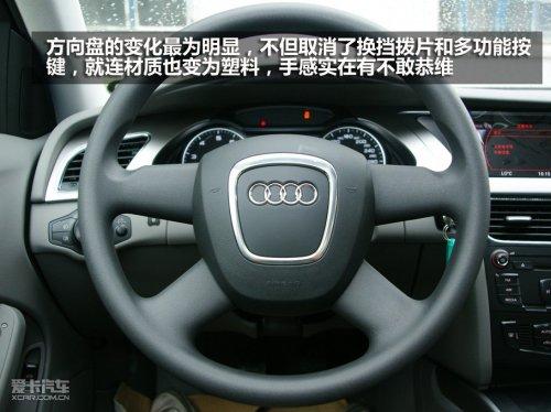 內飾中方向盤的變化最為惹眼,在取消了換擋撥片以及方向盤多功能按鈕之后,A4L政府公務版的方向盤讓人覺得光禿禿的,有戲不習慣。另外方向盤不再是真皮包裹,而改為了手感較軟的一體式塑料方向盤。雖然塑料的材質已經算得上優異,但手感相比真皮還是有些不敢恭維。
