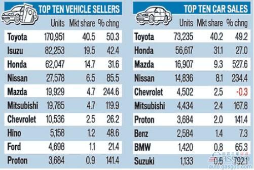 下表為今年前7個月泰國市場各車企汽車和轎車銷量排行榜: