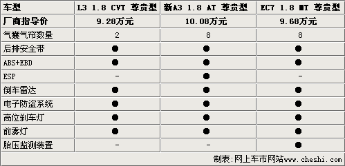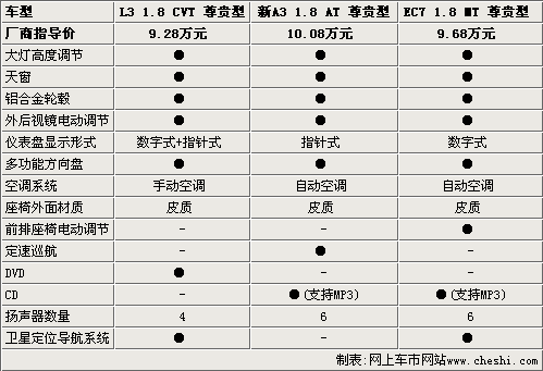 奇瑞新A3和帝豪EC7都采用自動空調,而比亞迪L3卻依然采用手動機械式空調,相對而言有些落伍。奇瑞新A3雖然配備了定速巡航系統,在高速駕駛中可以帶來更多的舒適性,但個人認為也帶來一定的安全隱患。比亞迪L3配備了DVD系統,和帝豪EC7一樣都配備了GPS導航功能。奇瑞新A3配備支持MP3、WMA音頻格式的CD音響,與帝豪EC7一樣都配備6聲道音響系統,比比亞迪L3的音響效果應該更出色。