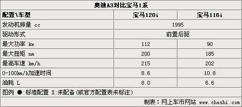 與奧迪剛剛在國內(nèi)投放的1.4T引擎的A3相比,寶馬116的發(fā)動機動力方面與1.4T的奧迪A3基本相當。兩款車型的各項技術(shù)參數(shù)例如加速時間、油耗表現(xiàn)也處于相近的水平上,可以說BMW 116i恰好可以在價位以及動力上滿足消費者的需求。目前奧迪A3 1.4T入門車型的價格是26.8萬元,如果未來BMW 116i的官方定價與我們的預測接近,那么25萬元左右的價格加上2.0升排量和后輪驅(qū)動,絕對稱得上是奧迪A3的勁敵。