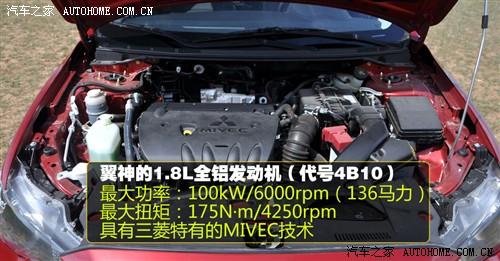 翼神的1.8L全鋁發動機(代號4B10)和2.0的一樣都是進口的,最大功率100kW/6000rpm(136馬力),最大扭矩175N·m/4250rpm,具有三菱特有的MIVEC技術。變速箱方面則沒有變化,依然搭配的是5速手動或6速INVECS-III CVT變速箱。