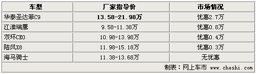 在五款自主品牌SUV中除了上市時間不長的海馬騎士外,其他4款車型均有不同程度的優惠。其中華泰圣達菲2.7L版本車型出現了2.7萬的最高優惠,其他三款車的優惠程度一般。