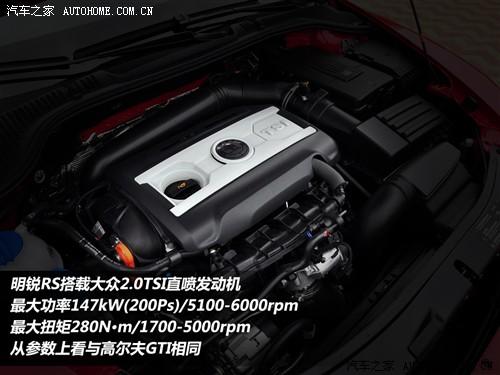明銳RS動力較之前款型有著明顯改善,搭載2.0TSI直噴發動機,最大功率200Ps/5100-6000rpm,最大扭矩280N·m/1700-5000rpm,發動機參數與高爾夫GTI和大眾CC相同,配合6擋雙離合變速箱駕駛感受會有提升。
