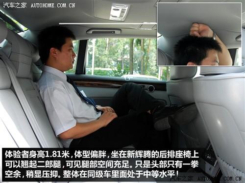 如果你是輝騰的車主那么一定更愿意坐在后排,那么乘坐空間肯定是第一位的,身高181cm的體驗者坐在后排腿部的縱向很充裕,但是受到車頂造型的影響頭部空間沒有想象的大有一拳左右,不過這樣的空間表現如果乘客不是過于挑剔應該可會滿意。